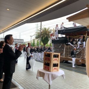 岸和田グランドホール だんじり試験曳き|今年も迫力満点のお披露目曳行でした♪ 2025.10.06 10月5日(日)、10月祭礼の試験曳きが行われました♪ 皆様も各地区のだんじりの勇壮な姿を楽しまれたことでしょうか? 今年も岸和田グランドホール正面玄関前には、所在地の「小松里町のだんじり」と「下池田町のだんじり」がお披露目曳行にお越しくださいました。 毎年変わらぬ迫力と華やかさに、スタッフ一同感動いたしました! 日頃の感謝を込めまして、今年も両町へ瓶ビールを2ケースずつ贈呈させていただきました。 地域の皆様とのつながりに改めて感謝し、これからも岸和田グランドホールは地域とともに歩み、発展に貢献してまいります。 10月祭礼に関わる皆様が安全で楽しいお祭りを迎えられますよう、心よりお祈り申し上げます。 本曳きもどうぞ盛大で素晴らしいお祭りになりますように♪ Post Share Hatena Pocket feedly Pin it 岸和田グランドホール かつおとキノコの甘辛煮【ほてから放送レシピ】 岸和田市五風荘で「お月見団子ワークショップ」を開催し...