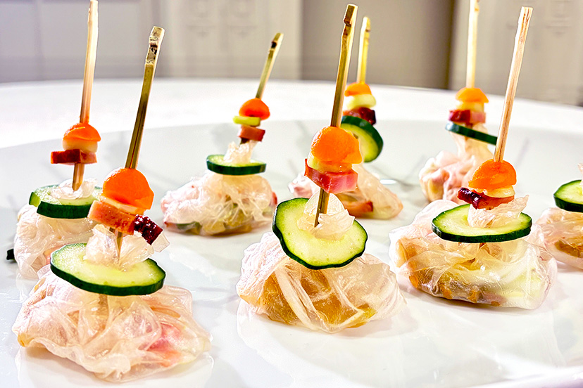 放送レシピ 生春巻 巾着風|シェフが教える家庭料理 2025.12.16 テレビ岸和田で放送されたレシピをご紹介! グランドホールのシェフが、自宅で簡単に作れる料理のコツをお伝えします。 材料8個分 きゅうり 1/2本 ザーサイ 30g 焼豚 20g 長ねぎ 1/4本 ライスペーパー 8枚(直径約15cm) ※具材はエビ・タコ・ボイルした豚肉などでも可。 また、素材に合わせたソースを一緒に包んでもよい。 飾り用 ■ 焼豚 厚さ2〜3mm/1cm角……8枚 ■ きゅうり 厚さ2〜3mmの薄切り……8枚 ※中心を直径約1cmくり抜いておく ■ にんじん くり抜き器使用……8個 または厚さ2〜3mm/1cm角……8枚 ■ くり抜き器 (あれば)直径6〜8mm ■ 竹串またはつまようじ 8本(長さ4〜5cm) 作り方 ① 飾り用のにんじん・焼豚・きゅうりを準備し、竹串に刺しておく。※にんじんが硬い場合は、くり抜いた後にさっとボイルする。 ② きゅうり・ザーサイ・焼豚・長ねぎを、長さ3〜4cmの細切りにする。 ③ ライスペーパーをさっと水にくぐらせ、水で湿らせたキッチンペーパーの上に広げる。 ④ ②の具材をのせて包む。包む際、輪切りにしたきゅうりの穴にライスペーパーの先端を通して固定すると、巾着型になる。 ⑤ 飾り用のにんじん・きゅうり・焼豚を刺した串を、巾着の口に刺して飾る。 Post Share Hatena Pocket feedly Pin it 放送レシピ カップで作る小籠包|シェフが教える家庭料理