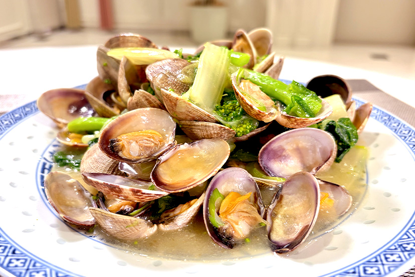 放送レシピ アサリとなの花の葱生姜風味煮込み|シェフが教える家庭料理 2026.03.01 テレビ岸和田で放送されたレシピをご紹介! グランドホールのシェフが、自宅で簡単に作れる料理のコツをお伝えします。 ▶ シェフが教える家庭料理|テレビ岸和田 ⧉ アサリとなの花の葱生姜風味煮込み 材料2~3人前 殻付アサリ 600g 菜の花 50g セロリ 50g 白葱 1本 生姜 1かけ サラダ油 大さじ3 【A】 ■中華スープ 100cc ■紹興酒 大さじ1 ※料理酒でもOK 【B】 ■旨味調味料 少々 ■塩 小さじ1/2 ■砂糖 少々 ■水溶き片栗粉 適量 ■ごま油 少々 作り方 アサリは、ひたひたの2%の塩水(水3カップに対し塩小さじ1)に数時間つけて砂出しをし、流水でこすりながら汚れを落とす。 菜の花は半分の長さに切り、セロリは筋を取り、一口大に切る。 白ねぎは斜めの細切り、生姜も細切りにする。鍋にサラダ油を入れて熱し、香りが立ち、しんなりするまで炒める。 (3)にAと菜の花、セロリを加えてひと煮立ちさせる。(1)のアサリを加え、ふたをして、アサリの口が開くまで中火で蒸し煮にする。 アサリから出る塩加減を見て、Bの調味料で味を調える。水溶き片栗粉でとろみをつけ、仕上げにごま油を回しかける。 ポイント ・⑴の砂出しは、ひたひたの2%の塩水(アサリが少し水面から顔を出す程度)にすると、よく砂を吐く。 ・アサリは火を通しすぎると硬くなるため、加熱しすぎないよう注意する。(口が空いて1~2分) ・アサリの代用として、ハマグリやホタテ、ホタルイカなどでもよい。 Post Share Hatena Pocket feedly Pin it 放送レシピ 彩り巻き寿司|シェフが教える家庭料理