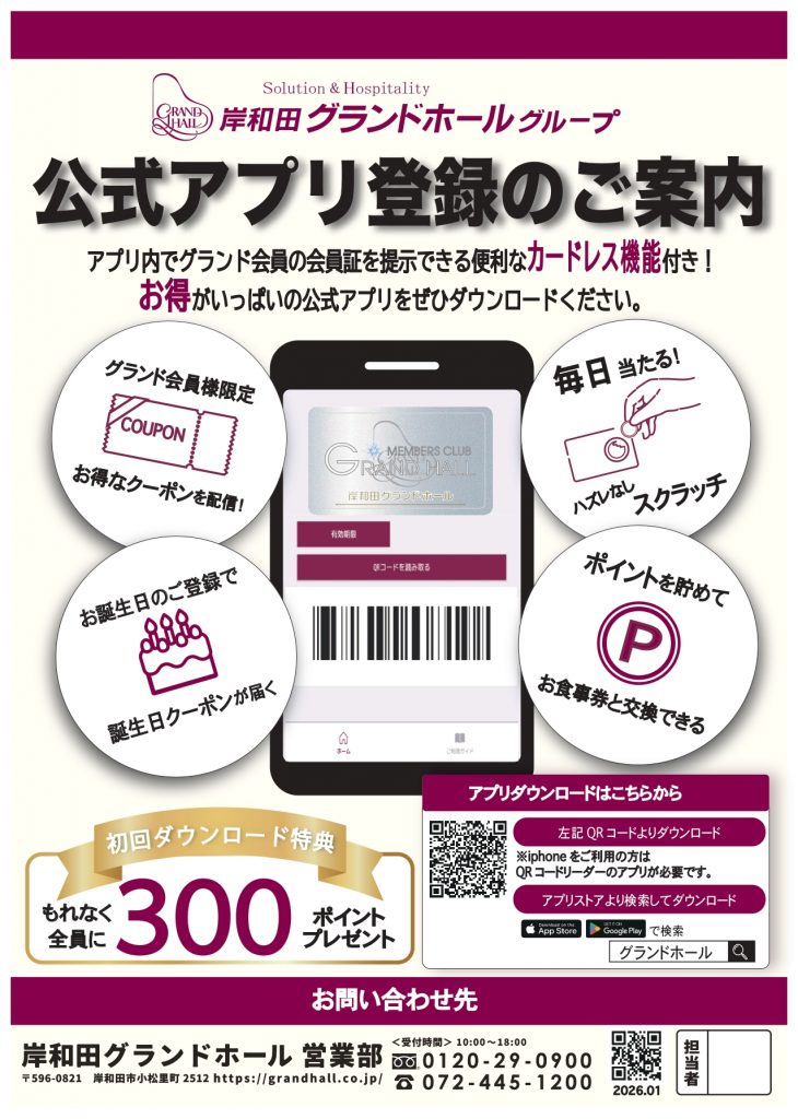 お知らせ 「グランド会員 公式アプリ」公開のお知らせ 2025.09.01 このたび、グランド会員様向けに「公式アプリ」の提供を開始いたしました。 アプリでは、カードを持ち歩かなくても会員証を表示できるほか、最新情報やお得なキャンペーンのお知らせ、クーポンの配信など、便利でお得な機能をご利用いただけます。 今後は、会員様向けのご案内を公式アプリから配信してまいります。 ぜひダウンロードいただき、快適にサービスをご活用ください。 Post Share Hatena Pocket feedly Pin it 岸和田市立公民館:秋のシェフクッキング|市立公民館・... 売切れ御免・数量限定品|「岸和田だんじり祭」オリジナ...