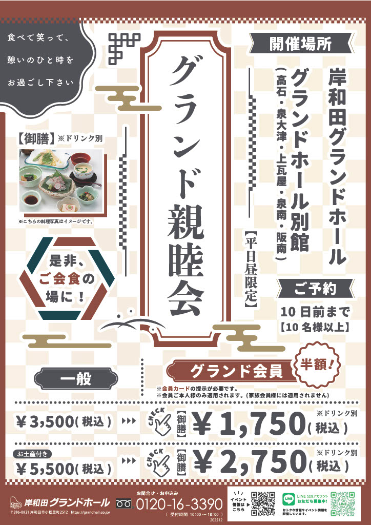 イベント グランド親睦会のご案内 2025.03.17 食事を囲みながら、親しい方々と穏やかなひとときを過ごしませんか。 食べて笑って、憩いのひと時を。ぜひ皆様のご会食の場としてご利用ください。 開催日平日昼限定(ご予約は10日前まで) ご利用人数10名様以上 開催場所岸和田グランドホール・グランドホール別館(高石・泉大津・上瓦屋・泉南・阪南) 料金一般:3,500円(税込) グランド会員:1,750円(税込) お土産付きプラン一般:5,500円(税込) グランド会員:2,750円(税込) 備考・グランド会員の方は、会員カードをご提示ください。 ・グランド会員ご本人様のみ適用、ご家族様には適用されません。 ・ドリンクは別料金となります。 お問い合わせ・お申込み 岸和田グランドホール 📞 0120-16-3390(受付時間 10:00~18:00) Post Share Hatena Pocket feedly Pin it 岸和田グランドホール「着付け教室」生徒募集中! お食事付きグランド落語会|つながる心を大切に